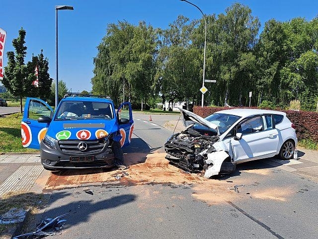 Nach einem Verkehrsunfall mit zwei beteiligten Pkw liefen Betriebsstoffe aus den Fahrzeugen aus. Die Flüssigkeiten wurden mit Bindemittel abgestreut und die Fahrzeugbatterien wurden abgeklemmt.