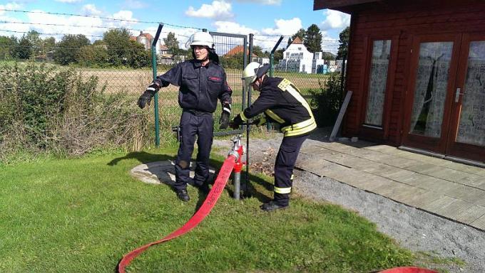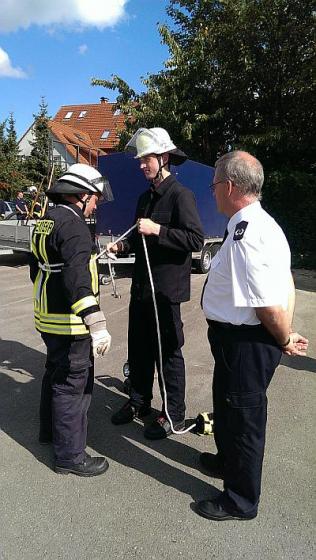 Unter den Augen der Prüfungskommission, bestehend aus je einem Vertreter aus jeder Wehrführung der 5 Kommunen, und bei schönstem Sonnenschein wurden 4 Löschangriffe in Gruppenstärke vorgenommen.