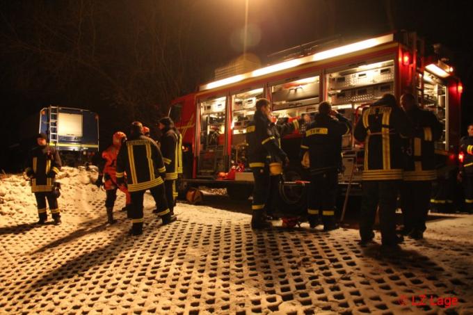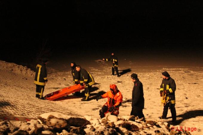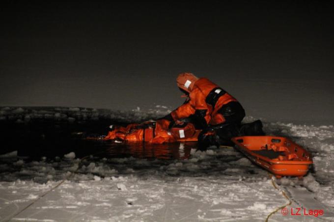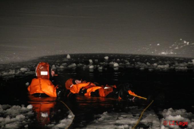 Am Montag Abend um 19:30 Uhr fuhren 13 Kameraden vom Löschzug Lage zu einem Angelteich an der Ottenhauserstraße, um die Rettung von im Eis eingebrochen Personen zu trainieren. Die Feuerwehr der Stadt Lage ist hierfür mit zwei speziellen Anzügen ausgestattet, wie sie auch als Überlebensanzüge in der Seefahrt eingesetzt werden.